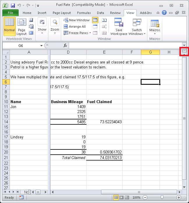 Move your curser to drag a split box (the small box at the top of the vertical scroll bar, or at the right end of the horizontal scroll bar; your cursor will change to a double headed arrow) in the direction you want the split to appear. To remove the split, move the pointer over the split line until the pointer changes to a double headed arrow, then double-click the split line.
