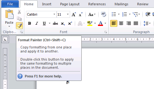 MS Office Tip: Double-clicking on the Format Painter icon will cause it to “stick”, so that you can continue to apply the desired format to multiple places. To turn this tool off, either press the Esc key or click the Format Painter icon again.